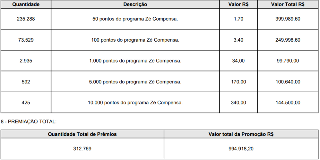 O brinde será entregue, sem qualquer ônus, na conta do programa Zé Compensa do consumidor contemplado, para utilização exclusiva nessa plataforma.